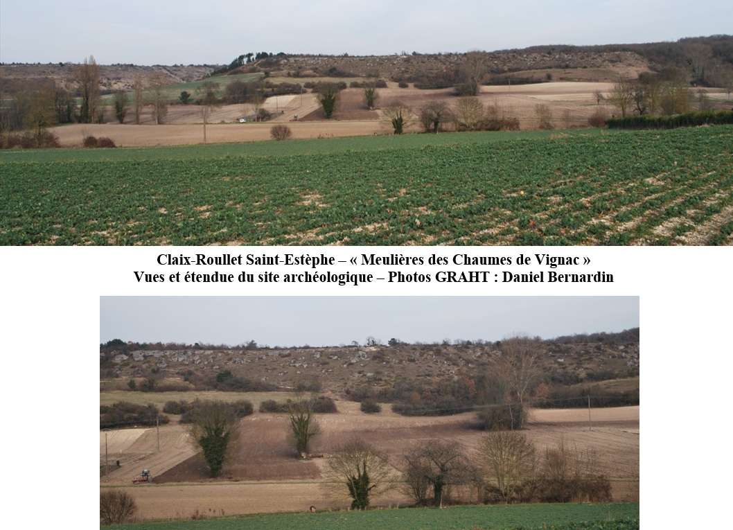 LES MEULIERES DE VIGNAC - LES CHAUMES DE VIGNAC A CLAIX - ROULLET SAINT-ESTEPHELES MEULIERES DE CHAUMES DE VIGNAC lE SITE ARCHEOLOGIQUE Les meulières des Chaumes de Vignac et du plateau des meulières, s’étendent sur une vaste surface qui englobe un territoire s’étendant du hameau de Vignac, à celui des Baudries commune de Roullet, jusqu’à celui de Chez Verguin sur la commune de Claix. Ces carrières, qui s’étendent sur une surface d’environ 30 hectares, tout comme celles étudiées par le GRAHT sur la commune de Mouthiers sont parmi les plus riches pour leur passé et leurs vestiges répertoriées en France. Une première mention de meulières à Claix et à Roullet apparaît dans les textes en 1306. Possessions de l’évêché d’Angoulême, le seigneur Alain Delisle et le prieur d’un établissement religieux des environs reconnaissent tenir chacun des carrières de leur suzerain, l’évêque de la cité Angoumoisine. Ces meulières resteront propriété de l’évêché jusqu’au XVIIIe siècle, puis des seigneurs de Claix, les Calluau au XVIème siècle, puis ensuite les Boisson au XVIIème. Orienté du nord au sud sur environ 20 hectares la carrière de meules, dévoilent de longs couloirs de gradins qui s’étirent sur tout ce territoire. Sur cette étendue immense surgirent des fouilles archéologiques menées par Alain Belmont en 2008, des dizaines de négatifs de meules, de multiples échecs d’extraction, des meules brisées, ainsi que des portions, quart ou moitié de meules, gisent encore de nos jours, abandonnées sur le site archéologique. Les gradins s’élèvent tels des colonnes sur lesquels se superposaient les tailles de meules en cours d’exécution. Les premières meules extraites de la barrière calcaire mesuraient entre 70 et 80cm. Les fronts de taille parfaitement structurés s’alignent tels des futs ouverts vers le ciel sur plusieurs mètres de hauteur. Ici était extraites les meules de l’époque médiévale avec des dimensions comprises entre 1,10m et 1,40m. Plus vers l’est du plateau, le diamètre des meules s’étire entre 1,56m, 1,64m à 1,68m. Les plus grandes atteignaient un diamètre compris entre 1,70 et 1,80m. Elles furent extraites dans des front de taille serpentiformes, rectangulaires dont certains atteignaient une cinquantaine de mètres. Ces meules étaient retirées sur un plan horizontal et sur plusieurs mètres de hauteurs, entre 3 à 8m de hauteur. Des milliers de meules seront retirées de cette vaste meulière et seront exportées jusqu’à environ 100km de leur site d’extraction. L’exploitation du site se poursuivra plusieurs siècles durant et les conséquences de cette activité intensive fut telle que le paysage en sera à jamais bouleversé. Devenu une étendue quasi désertique, occupée par une végétation constituée d’arbustes, de fourrés, de broussailles et de pelouses sèches, le sol sera totalement dépouillé de ses bois, de ses bosquets et de ses cultures au profit d’une lande inculte devenue le royaume des meuliers. Selon Alain Belmont, les meulières de Claix auraient été exploitées dès l’Antiquité ou le Haut Moyen-Âge. De ces meulières seront extraites des centaines de milliers de meules manuelles rotatives, des meules de moulins à grains monolithes ainsi que des demi-meules, pendant près de 2000 ans. L’aire de diffusion s’étendra à toute la région Poitou-Charentes. PREPARATION DE LA ROCHE MEULIERE Avant de commencer le travail de taille de la meule, le meulier choisissait avec soin le bloc dans lequel serait ensuite taillée la meule. Une fois ce choix opéré, il dessinait au compas les contours de celle-ci selon la commande et la dimension pour laquelle il devait tailler la roche. Ainsi, il utilisait son compas à l’aide duquel il traçait sur la roche le profil de la meule, puis il détourait à l’aide de son burin et de son marteau la circonférence de cette dernière. Petit à petit et jusqu’à ce que l’épaisseur souhaitée soit atteinte, il poursuivait sans relâche ce travail de percussion. Une fois achevée, il devait extraire la meule de son moule en introduisant dans les sillons de détourage des coins en bois ou en fer. Les coins en bois, généralement en sapin, étaient mouillés pour le faire gonfler ou dilater en épaisseur, ce qui provoquait l’éclatement et la séparation de la meule de son moule et ainsi provoquer son décollement ou détachement, du banc de roche. Les meules sont d’abord dessinées grâce au compas puis “détourées” au burin dans le banc du rocher. On introduit dans les sillons de détourages des coins de fer ou de sapin sec. Ces derniers sont mouillés et en gonflant ils provoquent le détachement de la meule de la paroi. Selon le professionnalisme des uns et des autres, ils œuvraient indépendamment à la future création. Les journaliers ou manœuvres dégageaient le futur bloc de sa croûte d’herbe et de terre. Ensuite le meulier préparait le bloc de roche et s’il était lui-même Maître Meulier il procédait à la taille de finition, à son extraction. C’est également eux qui assemblaient les meules lorsqu’elles étaient extraites en plusieurs quartiers. P style="TEXT-ALIGN: center">